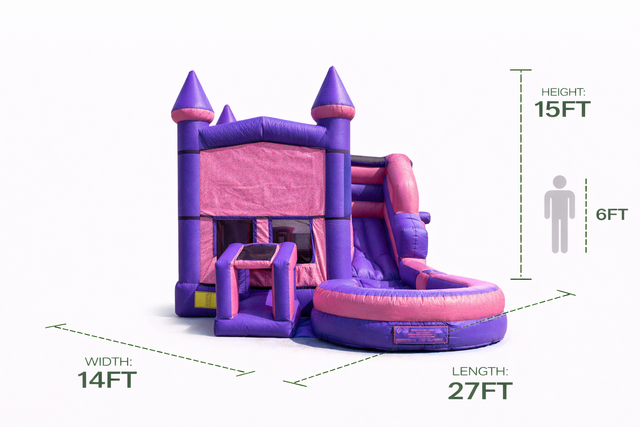 Designed with vibrant pink and purple colors, the PINK Castle Bounce House Wet/Dry is visually stunning and sure to capture the imagination of any child. Whether it's a birthday party, family gathering, or community event, this bounce house will be the highlight of the day.