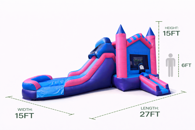 With its vibrant colors and enchanting design, the Enchanted Bounce House is sure to capture the attention of everyone at your event. This bounce house is perfect for both wet and dry use, allowing you to use it all year round.The wet feature allows you to attach a water hose and turn the bounce house into a water park, providing a refreshing and exciting way to beat the heat. The dry feature allows for traditional bouncing fun, perfect for any occasion.