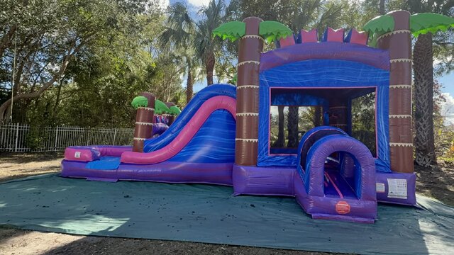 Introducing the Pink Paradise Princess Bounce House, the ultimate inflatable attraction for your child's next party or event. This enchanting bounce house features a delightful pink and purple color scheme, adorned with charming castle turrets that will transport your little ones into a world of fairytale fun. Designed with safety and enjoyment in mind, the Pink Paradise Princess Bounce House offers a spacious jumping area that can accommodate multiple children at once, ensuring endless hours of entertainment. Its durable, high-quality materials and reinforced seams provide peace of mind, allowing your kids to bounce and play with confidence. Perfect for birthday parties, family gatherings, or any special occasion, this bounce house is sure to be the highlight of the day. Easy to set up and take down, the Pink Paradise Princess Bounce House is available for rent, making it a convenient and hassle-free addition to your event. Let your child's imagination soar with this magical inflatable experience!