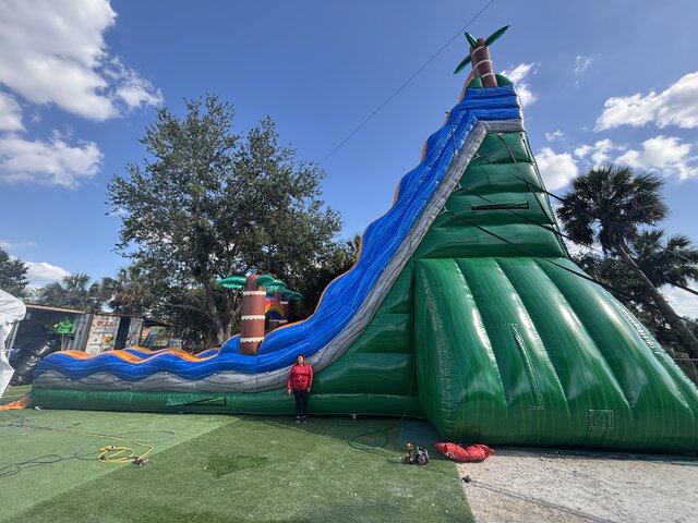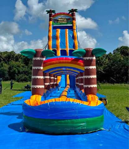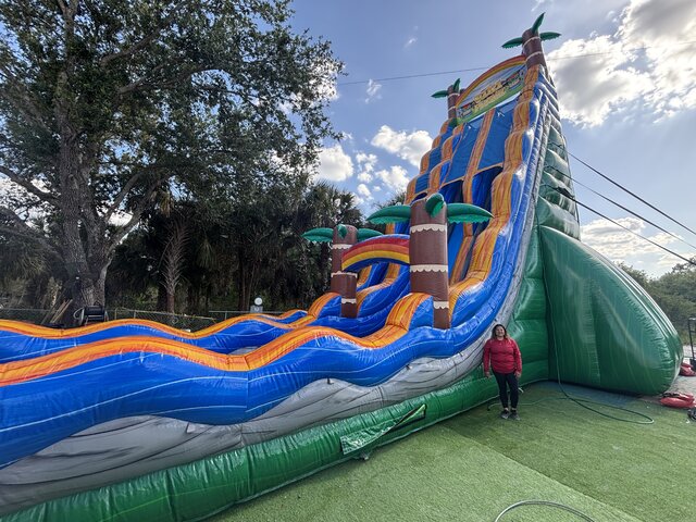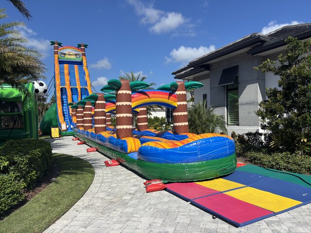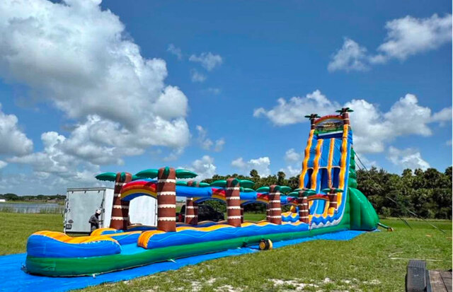 Make your event unforgettable with the massive 40FT Tiki Plunge Water Slide, one of the tallest inflatable water slides available in Southwest Florida. This giant tropical slide is perfect for school field days, corporate events, HOA parties, church festivals, and large backyard parties.
